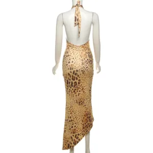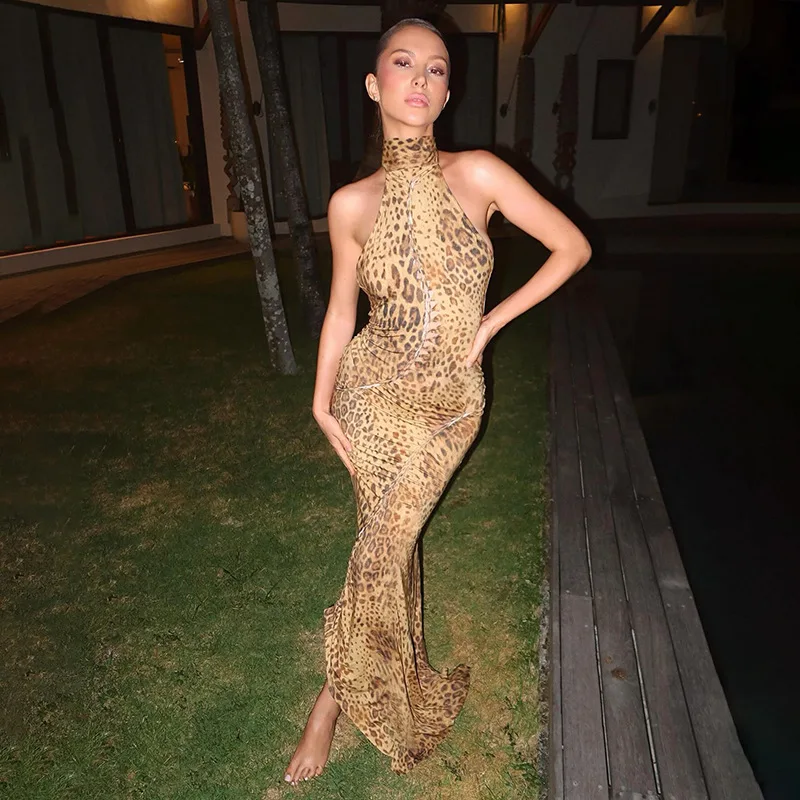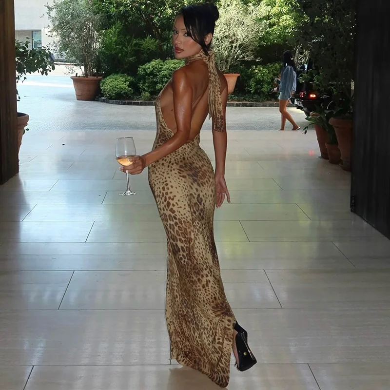 Unleash your wild side with the Open Back Leopard Print Maxi Dress – a chic statement piece designed for confidence and comfort. Crafted from a polyester-spandex blend, this bodycon silhouette hugs your curves while allowing effortless movement. The sleeveless O-neck design and daring open back detail make it a versatile outfit that turns heads from day to night.